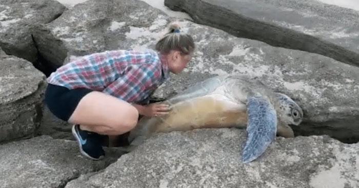 The couple went for a morning walk on the beach to watch the turtles. They soon noticed a turtle, but it was in big trouble. He needed their help because he was stuck in a rocky crack.