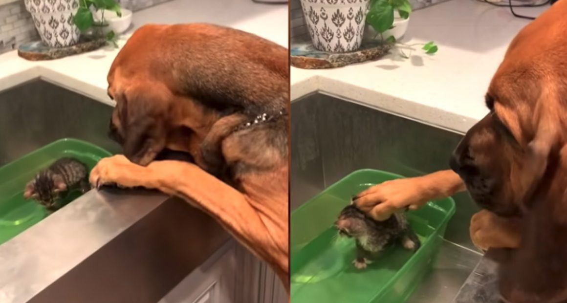 Vet tech Stephanie Vice has captured the moment Bloodhound Ruby Jane, 5, decided to help wash one of the kittens she and husband Matthew adopt from their Florida home. The cute dog uses her paw to gently pat Boddy’s head and help bathe the cat in the kitchen sink. Very beautiful!