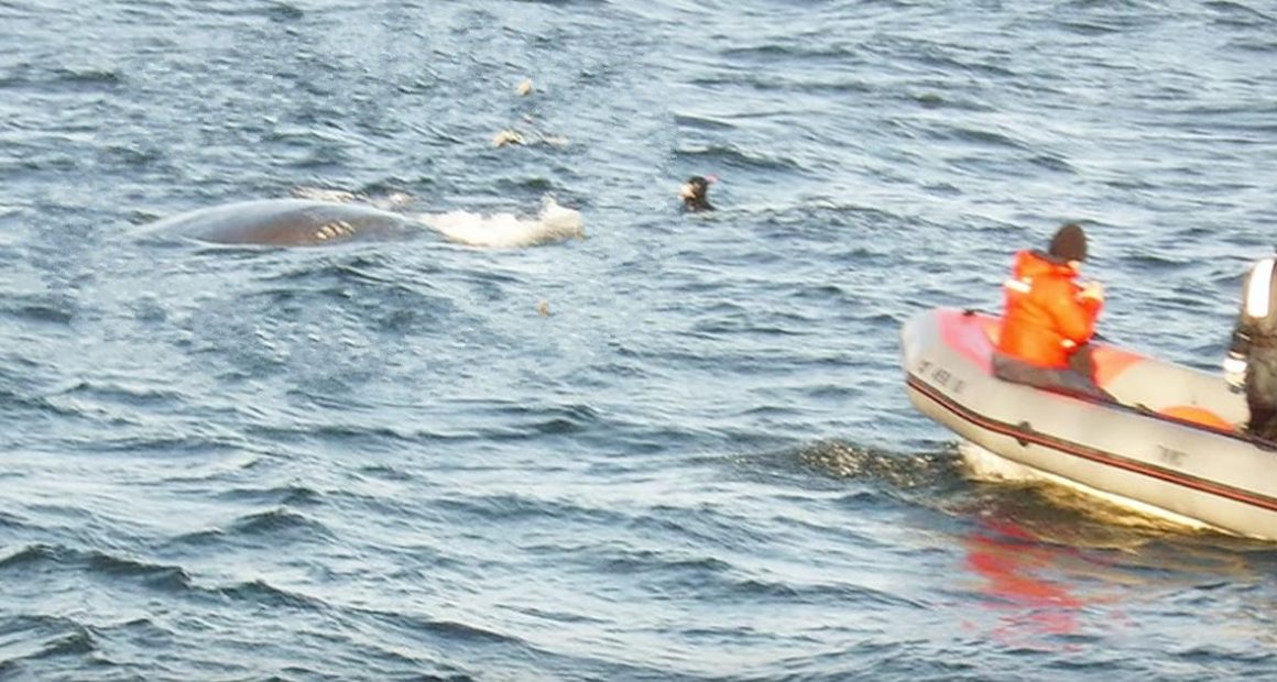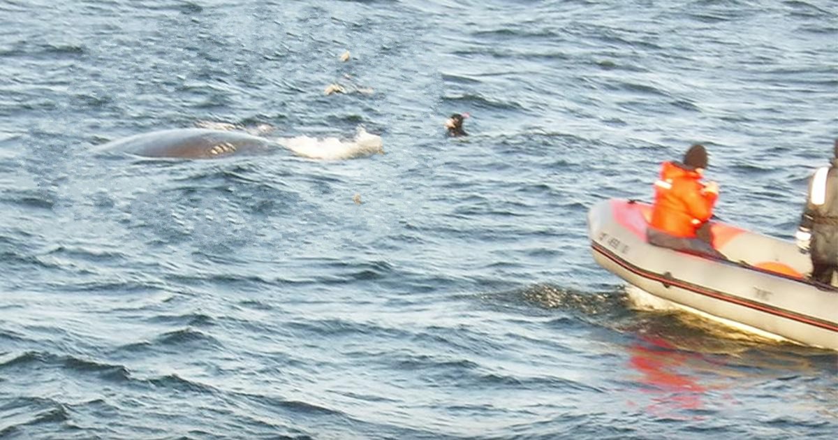 As soon as he approached the whale, he realized that the humpback whale was entangled in heavy crab nets that kept weighing him down. A whale cannot penetrate properly in such a situation; She was struggling to get out of the water to be able to breathe.