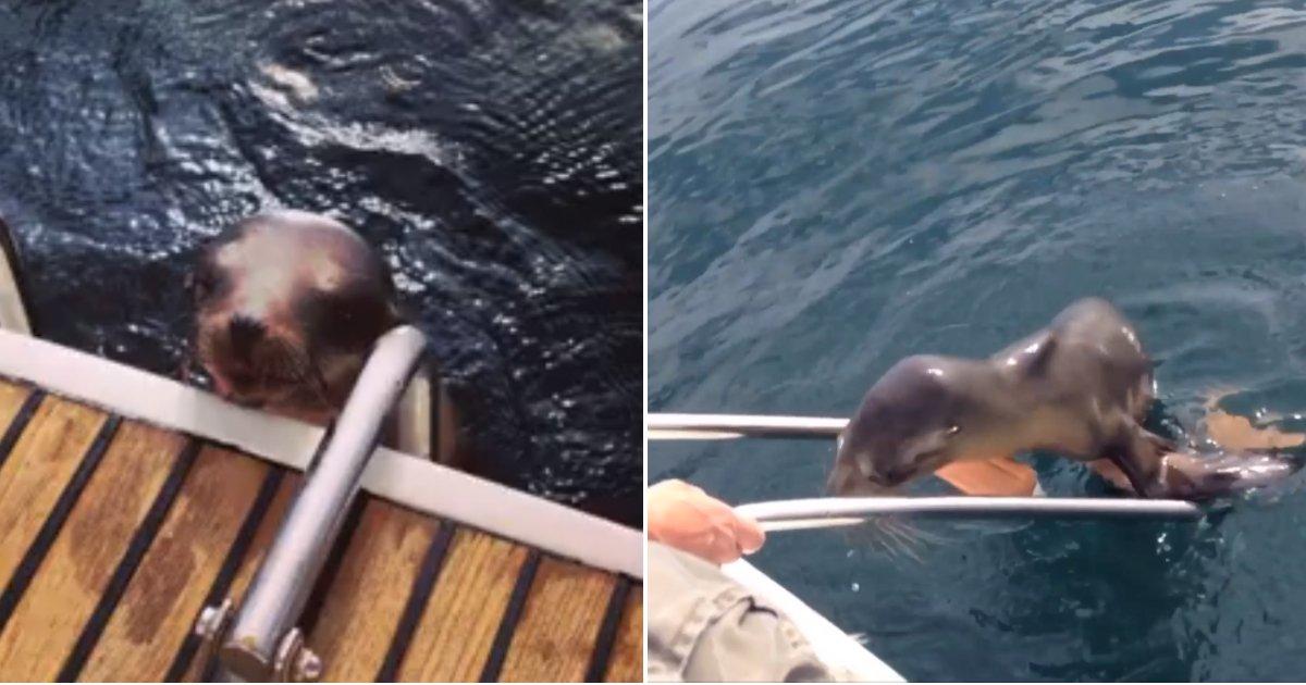 The people on the boat immediately started filming the event. The sea lion, named after amber, swam straight for the boat. Specifically, Amber swam up the ladder attached to the side of the boat into the water.