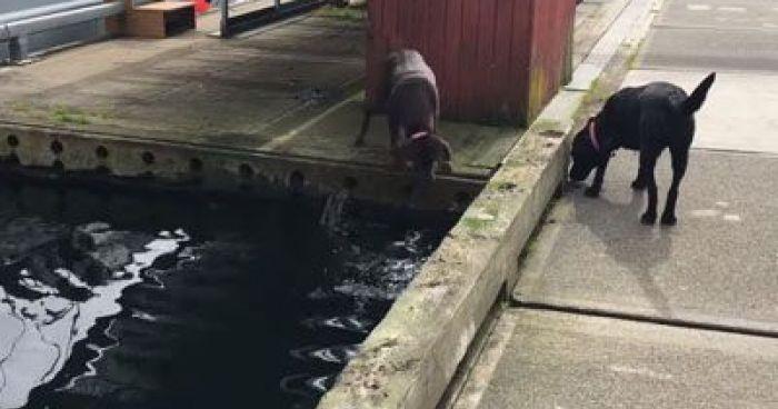 Robert Higgs shared a video of two Labradors on the web as they jogged by the water’s edge in the marina. And believe it or not, they had very unusual company.