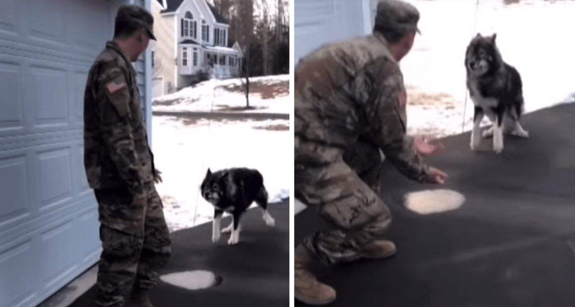 Maybe it was the uniform, but when the Indus ran outside to see who was there, he started barking at this “stranger” standing on his property. But it wasn’t long before the Husky mix realized he was its owner. It was then that the warm reunion took place.