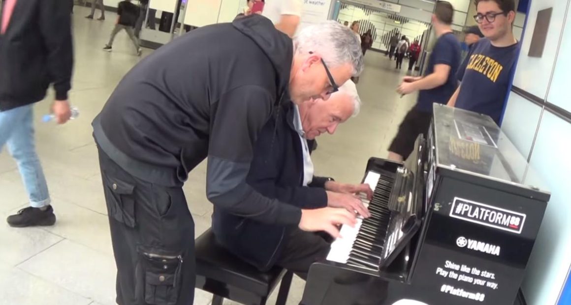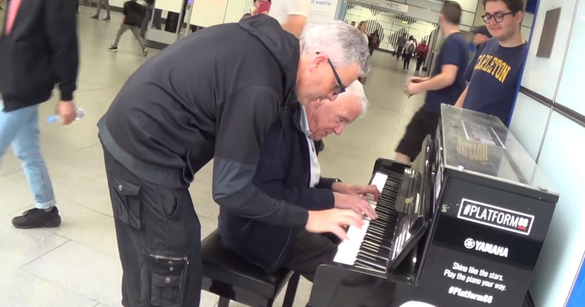 Transitioning seamlessly into a Mozart piece, the elderly gentleman is joined by the younger man, who effortlessly adds a touch of brilliance to the upper piano notes. With minimal exchange of words, they swiftly delve into an exuberant American jazz melody.