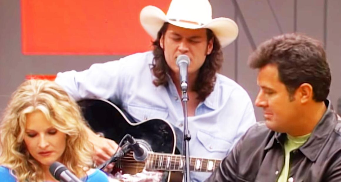 Recently, an online video surfaced, featuring a young Blake Shelton delivering a soul-stirring, acoustic rendition of “Austin,” reigniting our collective memories of this chart-topping hit. While the exact date of the recording remains unknown, a small circle of captivated individuals surrounds Shelton, hanging onto his every word. Among them sits none other than country music icon Vince Gill, attentively listening to Shelton’s acoustic performance of “Austin” before his rise to stardom.