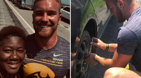 A University of Iowa football player has been praised for lending a helping hand to a stranger in need.