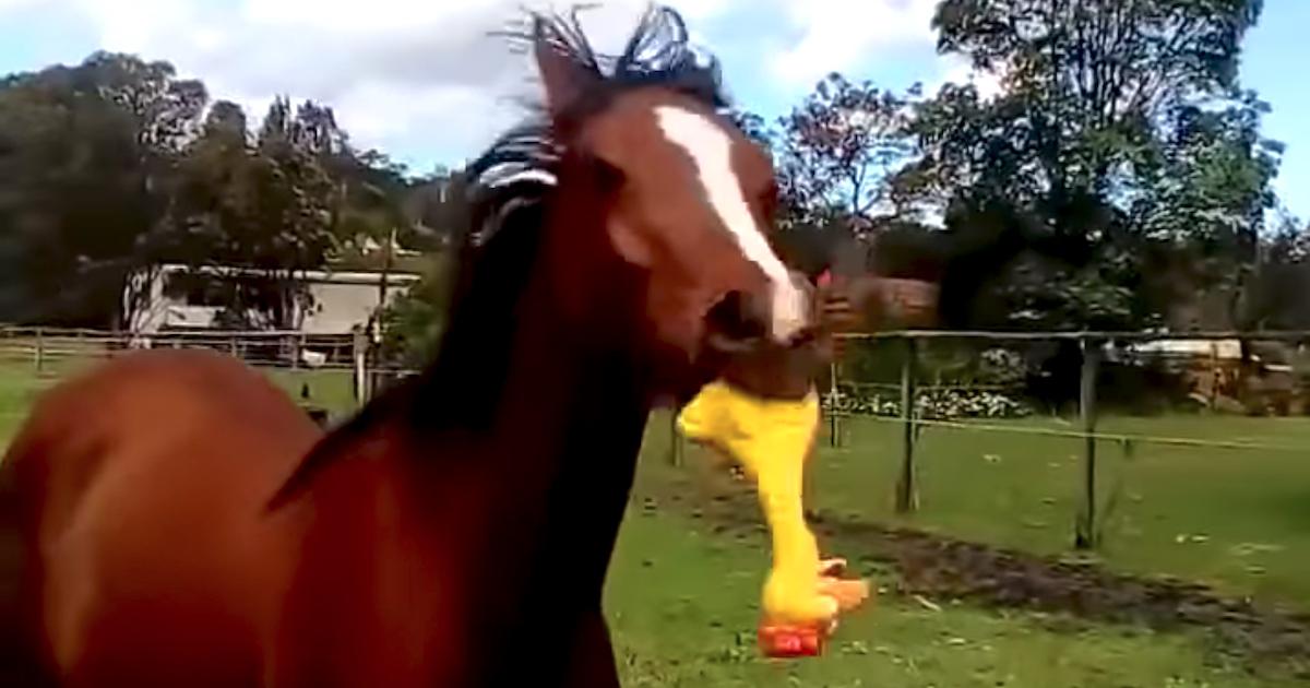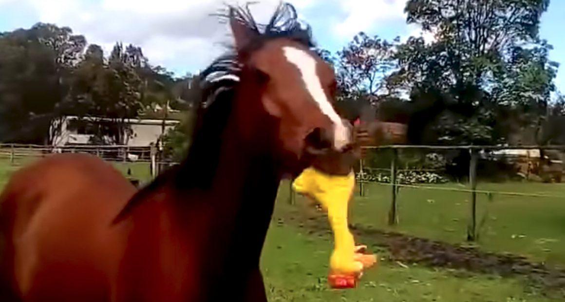 This particular horse has a favorite game – a rubber chicken of all things. He takes it with his mouth and turns it over to make as much noise as possible. He must love his owner! You imagine ? We love to see this happy boy having fun!