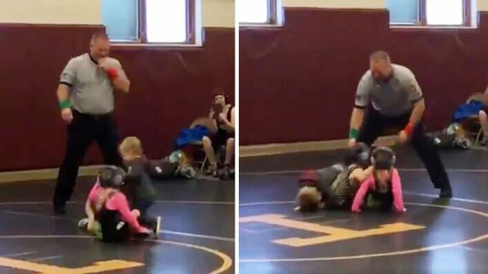 Watch the two-year-old come on stage and doze on the carpet to help his sister. He actually grabs his sister’s opponent and poses like a real wrestling superstar! All this while his father was filming the scene in a movie. The audience can’t help but laugh!