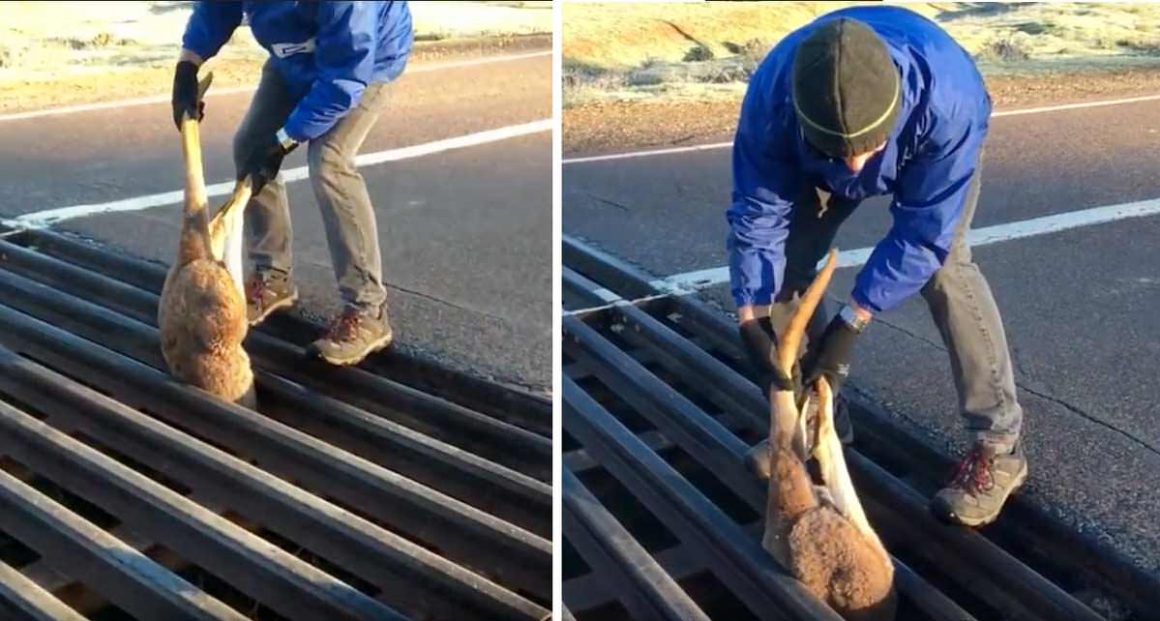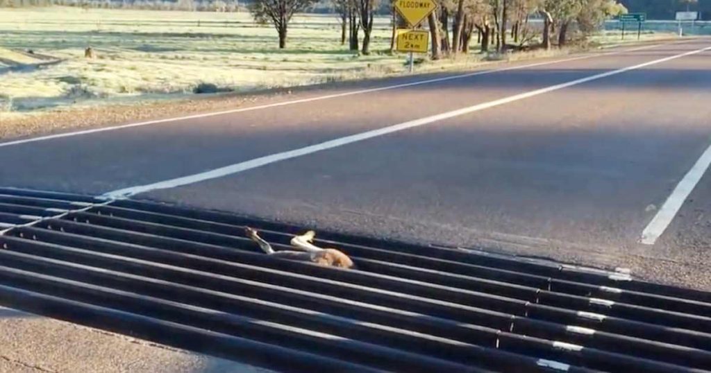 The cattle guard is built to prevent cattle from crossing the road using a network of metal rails with deep holes underneath. Cars can pass directly over the guard, but cows will not attempt to pass through it. But, another animal attempted to get past the cattle guard – and it found itself upside down, half of its body trapped under the net.
