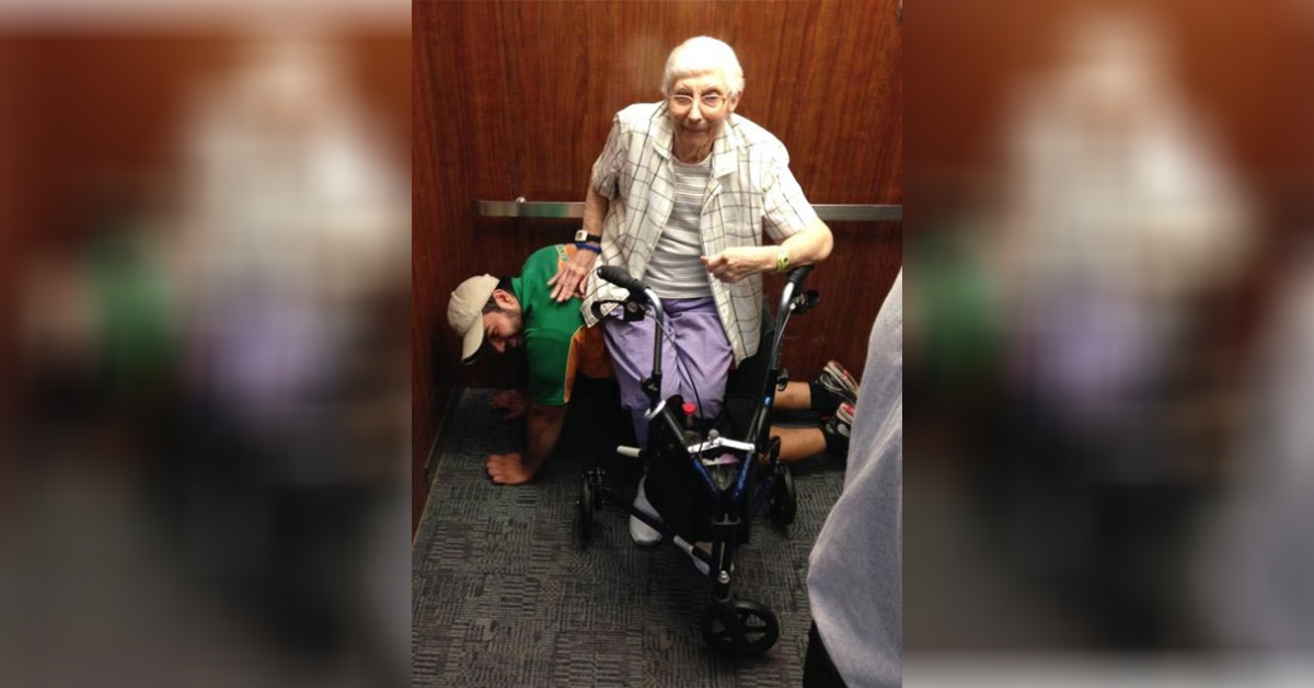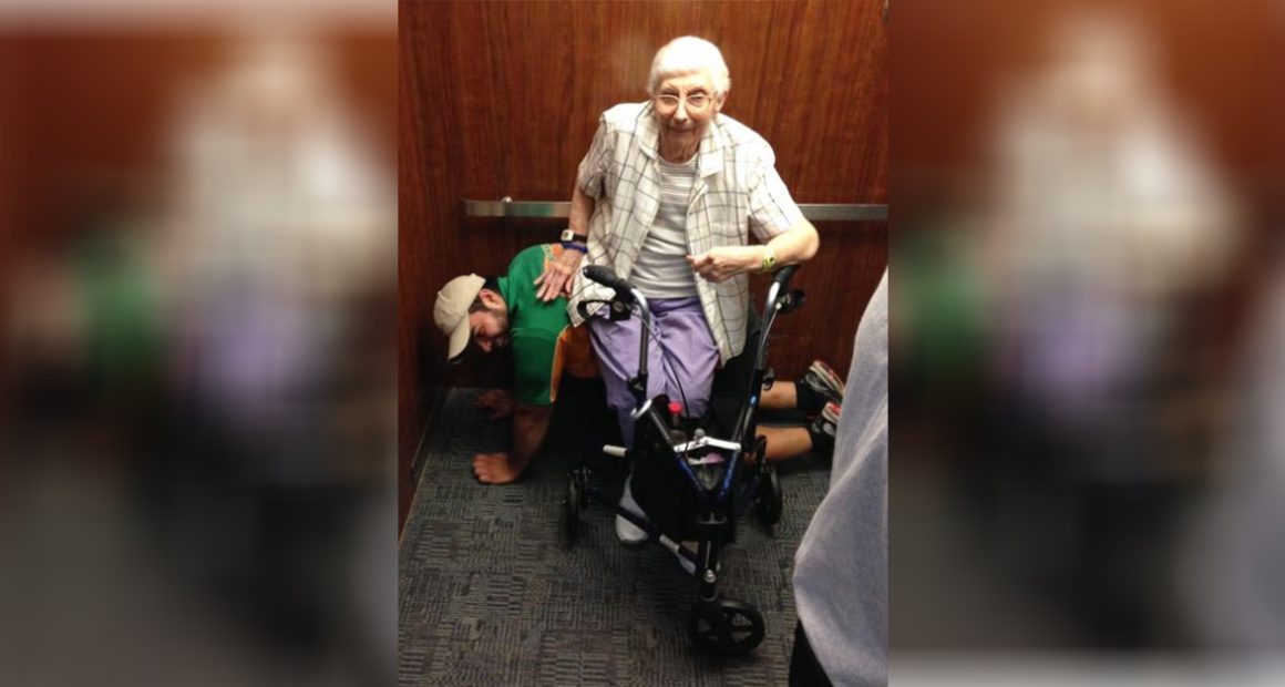 After hearing this, rather than bide his time in the pressured elevator, Cesar Larios decided to get on all fours and become a human chair for the struggling elderly woman.