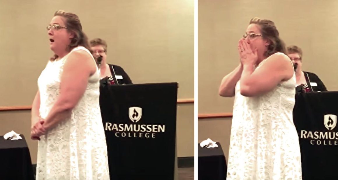 At the graduation party, Penny was thrilled to have her husband present his lapel pin. As she stood on the podium on stage, she was shocked to realize that a special guest was in the building ready to present her pin – and it wasn’t her husband!