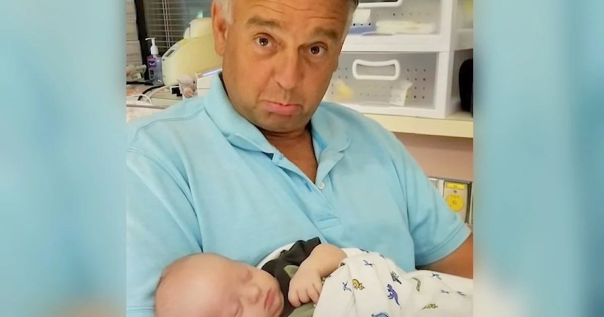 Happy grandfather approaches to meet his new grandchild and realizes his daughter deceived him