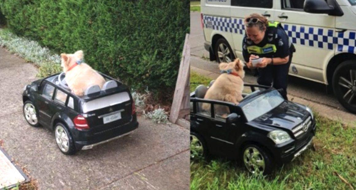 While driving through Heidelberg West, Australia, two police officers from Victoria saw a somewhat unusual but very remarkable sight; An old dog walking on the sidewalk in his miniature car!