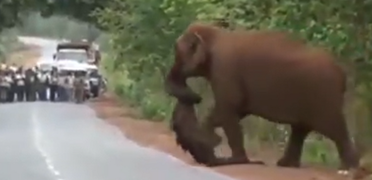 In the video, a large elephant can be seen carrying the body of a young elephant across a road. The elephant then sets the body down on the opposite edge of the road, and several other elephants approach. The group includes both adult and young elephants, and they pause around the young, deceased elephant.