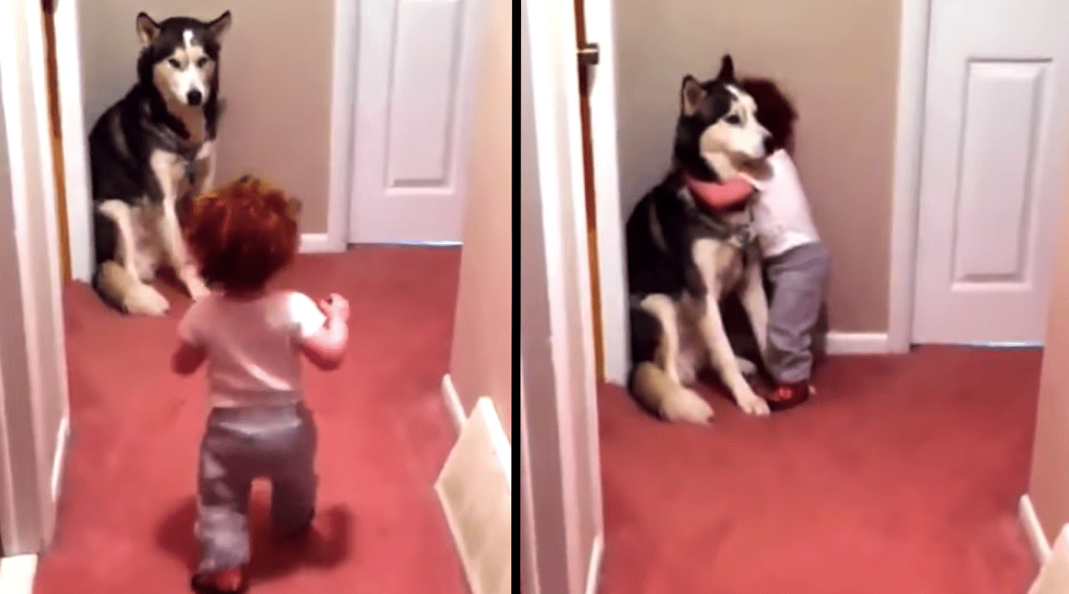 But dogs are also known to be fierce protectors and guardians of their people, and the Husky remains in the video below and puts a brave face on his little sister.