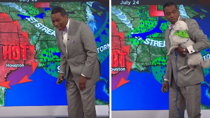 Television meteorologist Jambriel Marshall was delivering the local weather forecast when a cute little surprise swept across the plateau. The sweet white puppy interrupted the live broadcast from KPRC 2 news station in Houston, TX, but he made great TV!