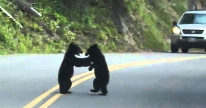 Their fun was recorded by a driver on a mobile phone, and the video quickly became a hit online. No wonder bears are so cute.