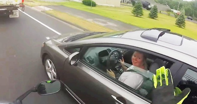 In this case, the woman driving a gray sedan was the culprit, brazenly cutting past a motorcyclist who was next to blend into the track.